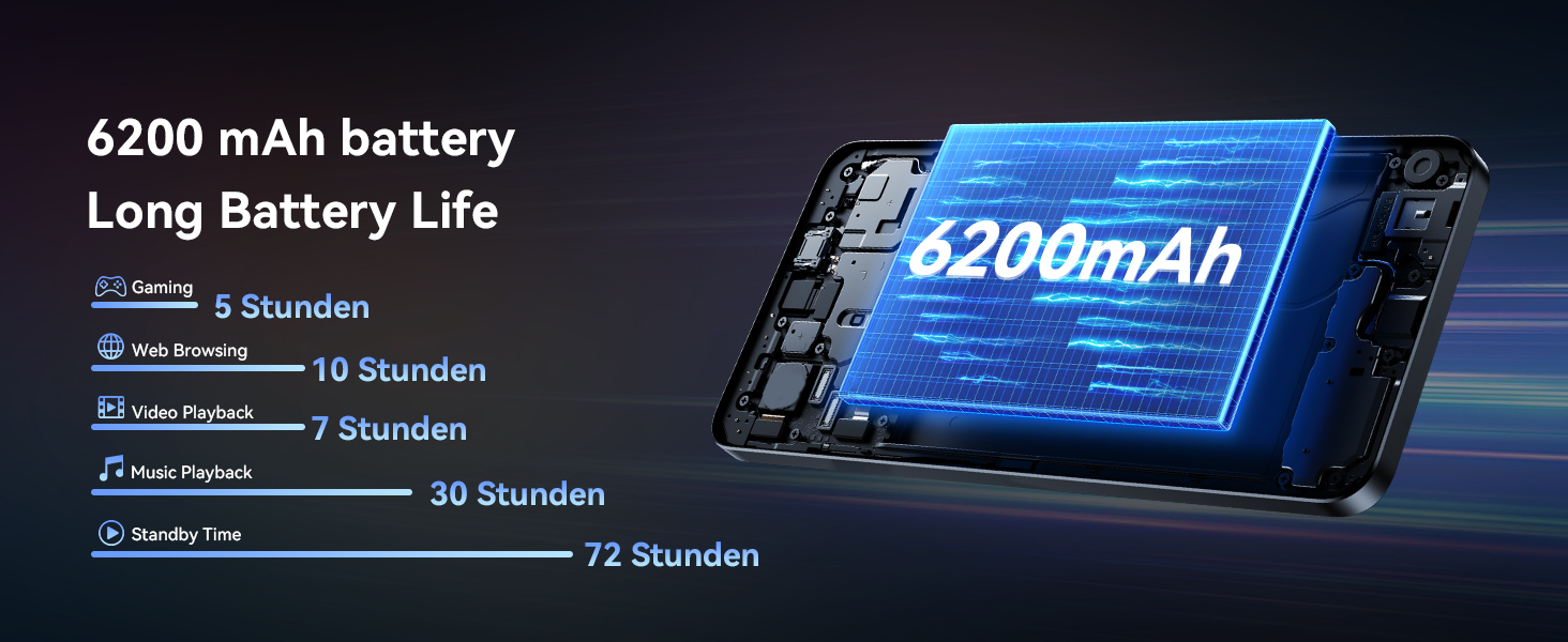 【6200mAh High-Capacity Battery & Optimized Endurance】The tablet 10 inch features a 6200mAh lithium-polymer battery that supports up to 4.5–5.5 hours of continuous use depending on usage scenarios such as video playback, gaming, or browsing. With intelligent power-saving modes, it offers reliable all-day performance, ideal for travel and daily use.