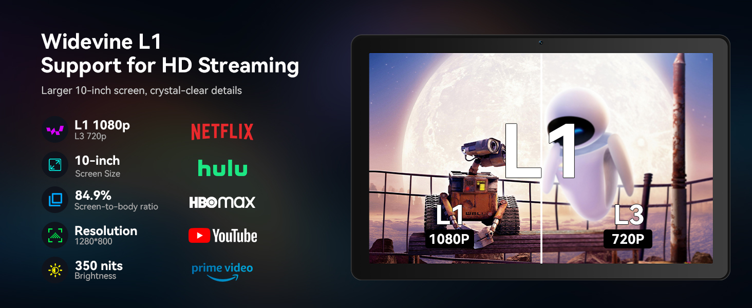 【10.1-inch HD IPS Display & Widevine L1 Certification】The android tablet enjoy a crisp and vibrant viewing experience on the 10.1-inch HD IPS screen with 1280×800 resolution. Certified with Widevine L1, the G13 allows streaming of HD 1080p content on platforms like Netflix, Disney+, and HBO, delivering a true cinematic experience.
