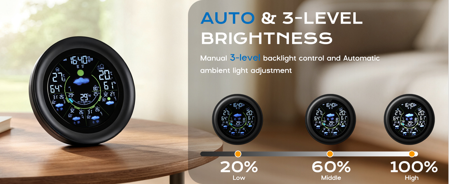 - 【Easy-Read Weather Station with Wide Viewing Angle】Specially designed for clarity, this wireless weather station features an advanced 180° wide-view LCD screen with enhanced colour contrast, ensuring perfect visibility from any angle – particularly ideal for elderly users. With both manual 3-level backlight control and automatic ambient light adjustment, it guarantees optimal readability whether wall-mounted or placed on a table. A thoughtful gift for home managers and weather-conscious moms.