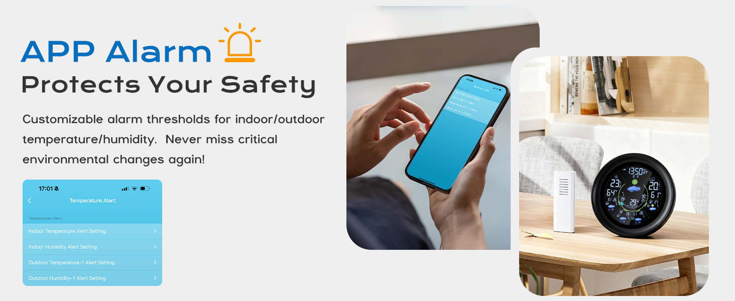 - 【Smart Alert Weather Station】Stay in complete control of your environment with instant App alerts when temperature or humidity exceeds your customized thresholds. Perfect for maintaining ideal conditions in reptile habitats, greenhouses, wine cellars and other sensitive spaces, this advanced station monitors both indoor and outdoor sensors, sending immediate notifications to your smartphone when levels deviate from preset ranges.