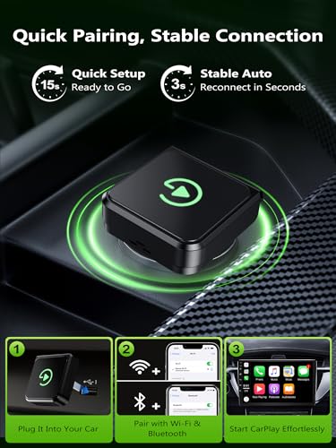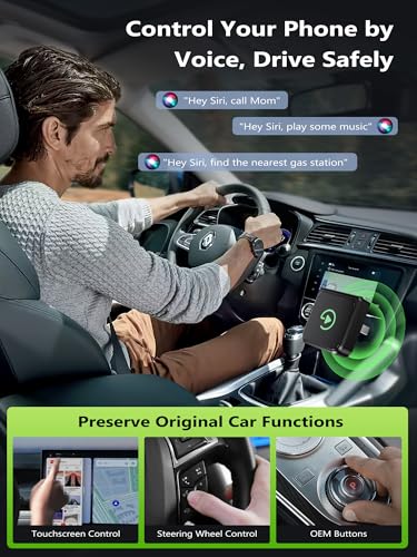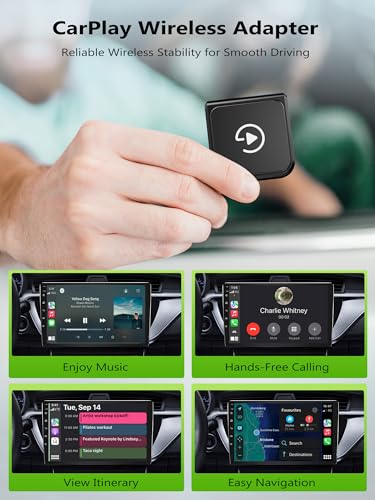 - Plug & Play and Secure Fit: Simple plug-and-play setup with automatic Wi-Fi connection after Bluetooth pairing. This CarPlay wireless adapter is compatible with Siri for hands-free operation—allowing you to stay focused on the road. It maintains original in-car sound quality for calls, navigation, and music. Built-in protection helps prevent overcurrent, overheating, or accidental disconnection during extended use.