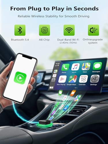 - Dual-Band High-Speed Transmission: Equipped with dual 2.4 GHz and 5 GHz Wi-Fi bands, this CarPlay wireless adapter ensures stable, low-latency performance. Enjoy smooth navigation, high-quality audio streaming, and clear phone calls without sudden disconnections. The upgraded Bluetooth 5.4 and 8A smart chip deliver faster pairing, improved stability, and reduced delay compared with other adapters, providing superior wireless performance for uninterrupted driving.