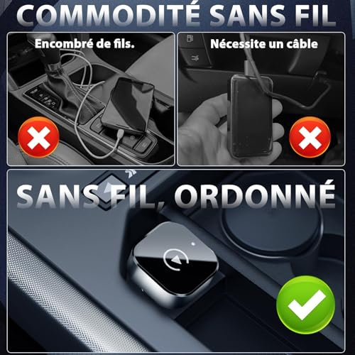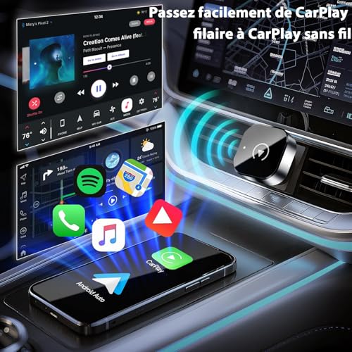 - CarPlay/Android Auto wireless adapter: No more cables! The wireless adapter can convert your wired CarPlay/Android Auto into wireless, 0 app downloads or other difficult steps. Just plug in, connect Bluetooth or WIFI, and enjoy features like music, maps, calls, and more