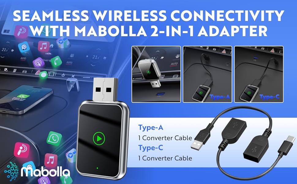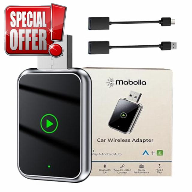 Meet the Mabolla 2 in 1 Wireless Car Adapter, the smarter way to enjoy effortless CarPlay and Android Auto connectivity. Compact yet powerful, it transforms your wired CarPlay system into a wireless one, freeing you from tangled cables and constant plugging in. Designed for convenience, stability, and premium performance — this device ensures a truly hands-free driving experience wherever the road takes you.