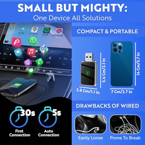 - COMPACT DISCREET DESIGN: The Apple car play wireless adapter is designed for a seamless integration into your vehicle's port. It provides a clean experience, ensuring the aesthetics and tidiness of your vehicle.
