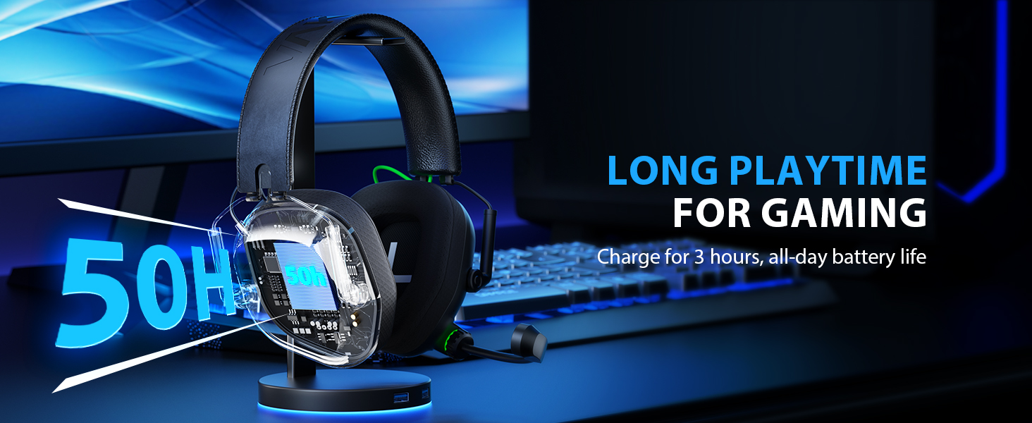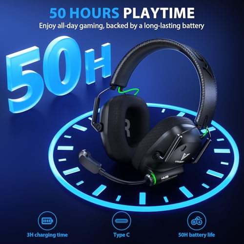 - 【Up to 50H Battery Life】Wireless PC gaming headset boasts an impressive 50-hour continuous gameplay runtime with a voice alert for low power, and charging the over ear headphone fully takes only 3 hours. The battery life varies by usage, you might need to charge it every 3-4 days on light use or charge it every 1-2 days heavy use. Whether you’re gaming, chatting, or listening to music, it keeps up with your rhythm