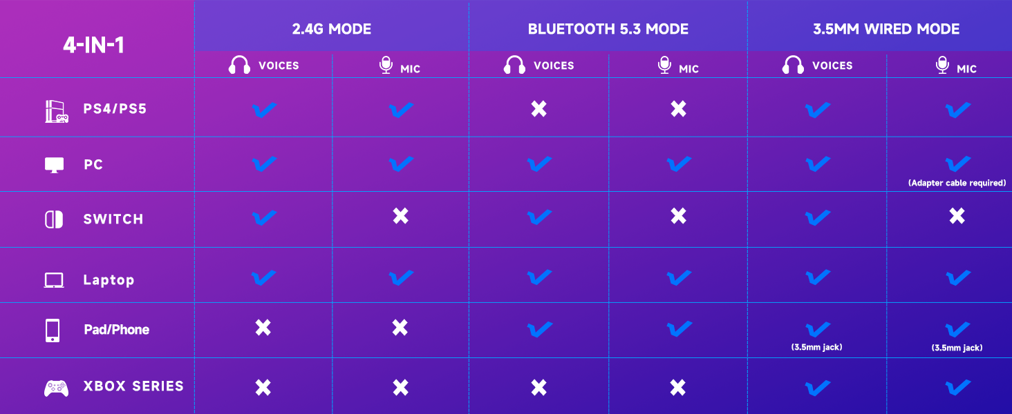 - 【3 Connection Types & Multi-Platform Compatibility】This Gaming Headphones supports 2.4GHz wireless, Bluetooth 5.4, and 3.5mm wired connections. Easily switch between devices like PS5, PS4, PC, Mac, Nintendo Switch, tablets, and phones. The included USB and Type-C wireless adapter for ultra-low latency connections and stable. With less than 20ms delay. Note: Microphone is not supported on the Switch. Xbox is only compatible in 3.5mm wired mode.