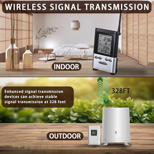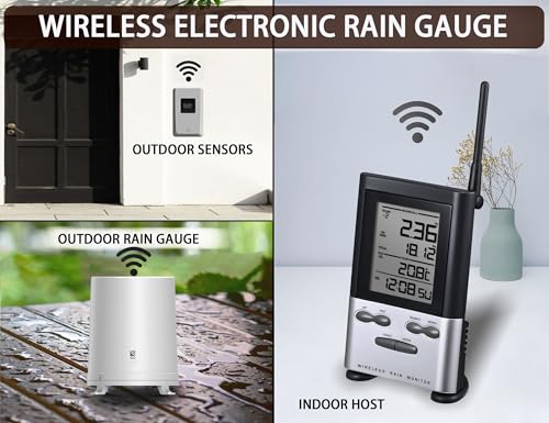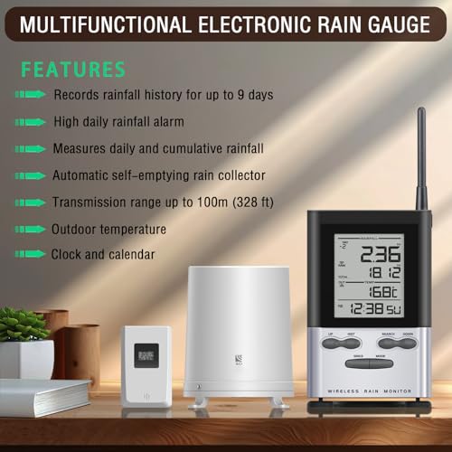 Wireless Remote Rain Gauge — This electronic rain gauges outdoors best rated measures rain precipitation with 0.1mm/0.01inch resolution,outdoor temperature sensor is high precise and accurate. Allowing you to monitor the rain condition in your backyard/garden/farm/land crop with 300FT/100M wireless transmission range.
