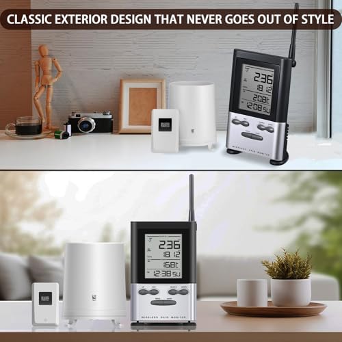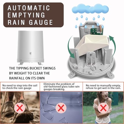 Self-Emptying Wireless Rain Gauge — The wireless rain gauge outdoor features a sensitive tipping bucket sensor that automatically records and transmits rainfall data. Easily install by connecting the outdoor sensor to the indoor display for real-time rainfall and temperature tracking. The measurements are displayed on an indoor digital console, allowing you to check daily and historical rainfall data without going outside.