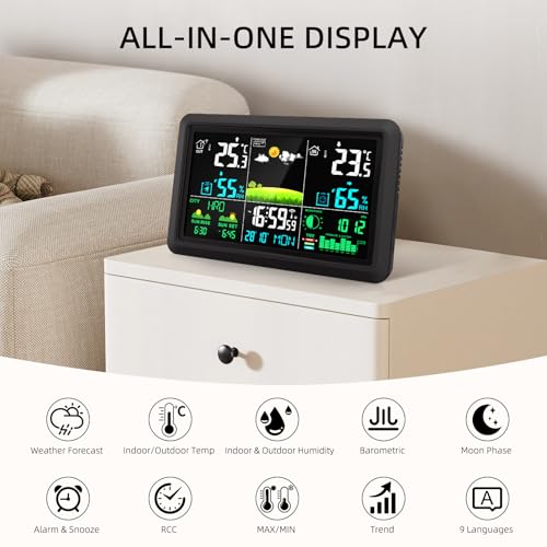 Wireless Weather Station with 1 Outdoor Sensors, 7.5″ Color Display, Indoor/Outdoor Temperature & Humidity, Barometric Pressure, Forecast, Moon Phase and Alerts for Home & Garde