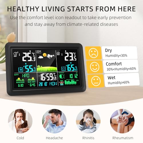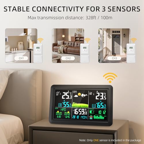 【Your Whole-Home Health Monitor, Room by Room】Worried about the baby's room being too cold or the wine cellar too damp? Home weather station supports connection with up to 3 wireless sensors (1 included) to monitor different zones simultaneously. Receive smart alerts for temperature/humidity extremes, safeguarding your family's comfort and your valuables.