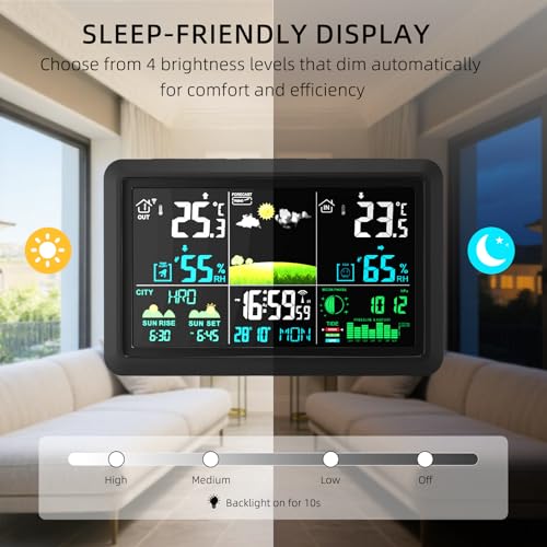 【Sunrise/Sunset Data for 162 Pre-loaded European Cities】Weather station pre loaded with sunrise and sunset times for 162 European cities across 32 countries including the UK, Germany, and France, aiding your daily outdoor activity planning. With a portable and compact design, it can be placed on a tabletop or hung on the wall using the eyelet. It's not just a precise weather station but also a thoughtful alarm clock for your bedroom, kitchen, or office.