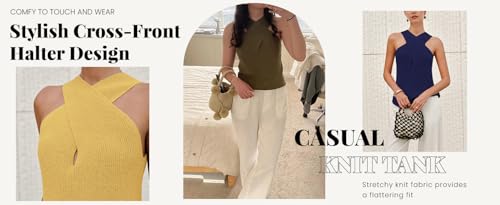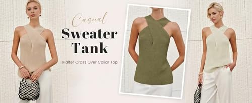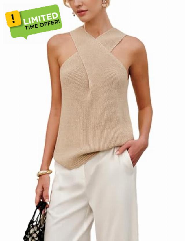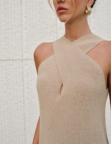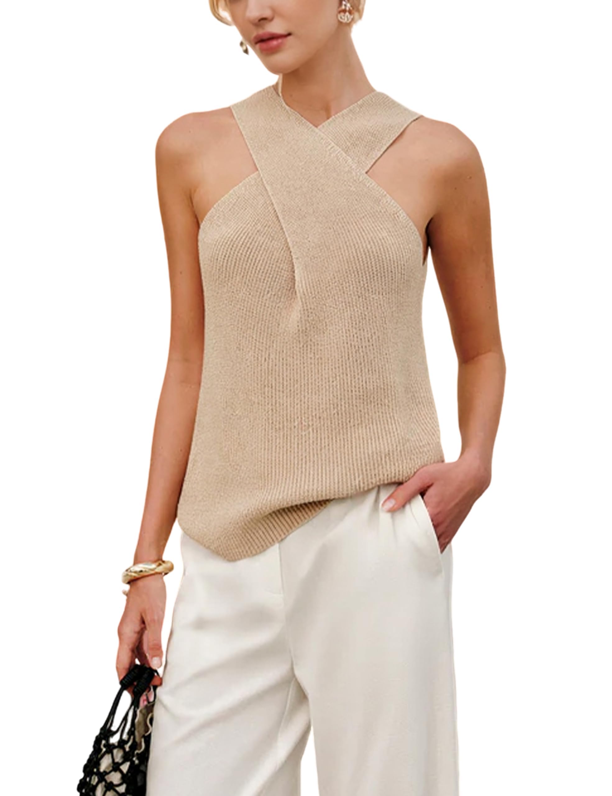 Women’s Cross – Halter Knit Top, Sleeveless Beige Knitted Vest, Stylish Crossover Neckline Tank