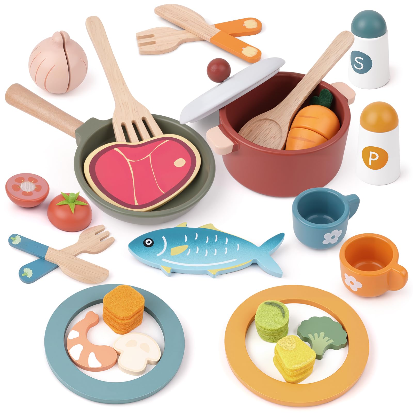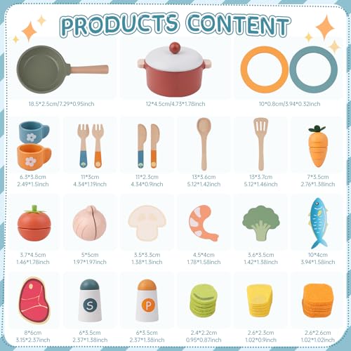Kids Wooden Kitchen Toy Set: The wooden food for play kitchen for kids includes fish, beef, felted vegetable slices, pepper, salt, cutlery, cups, utensils, cuttable fruits and vegetables, and two sets of realistic pots and pans. Designed for kids aged 3 and up, the play kitchen accessories are realistically detailed and sized for small hands, bringing your kids a real kitchen experience.