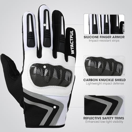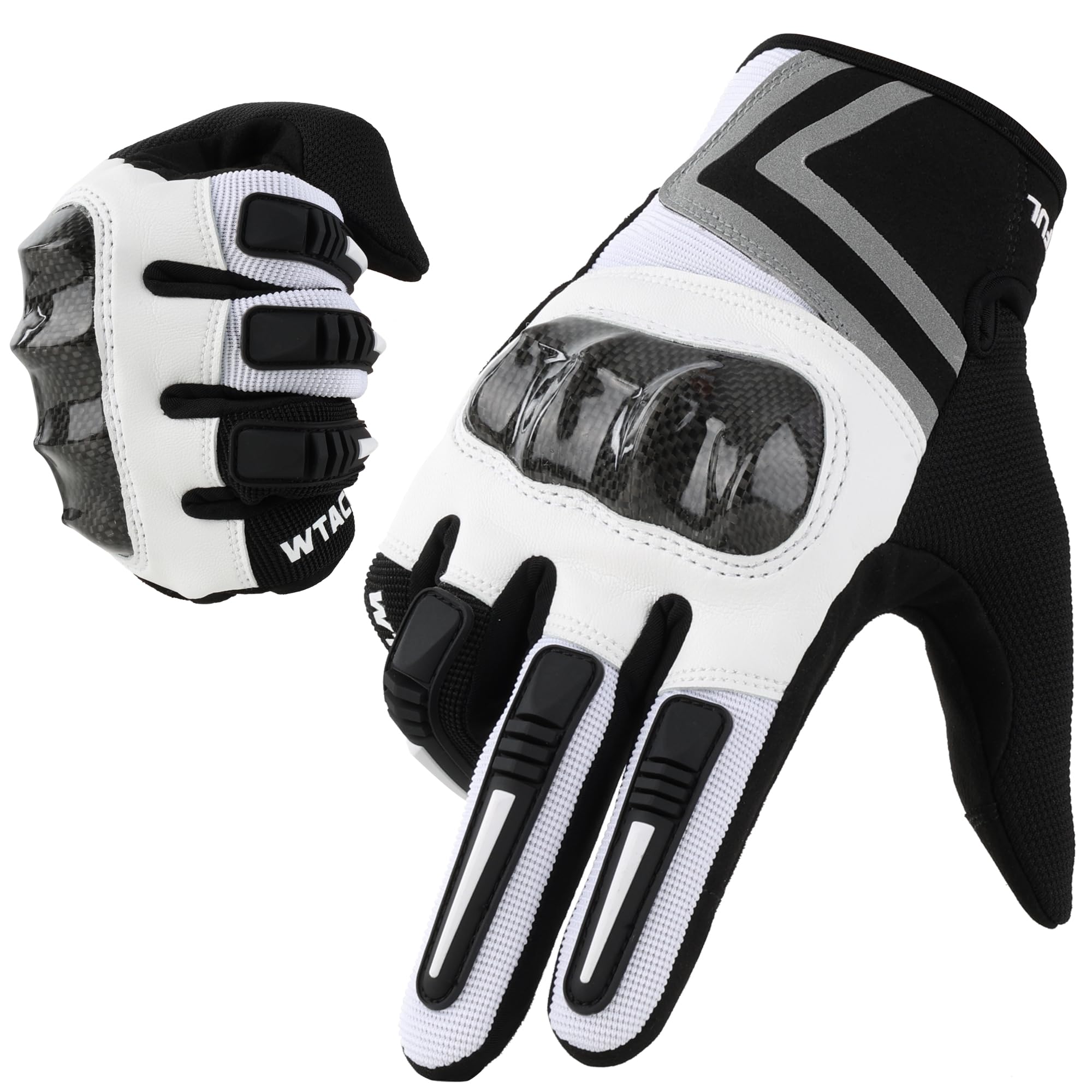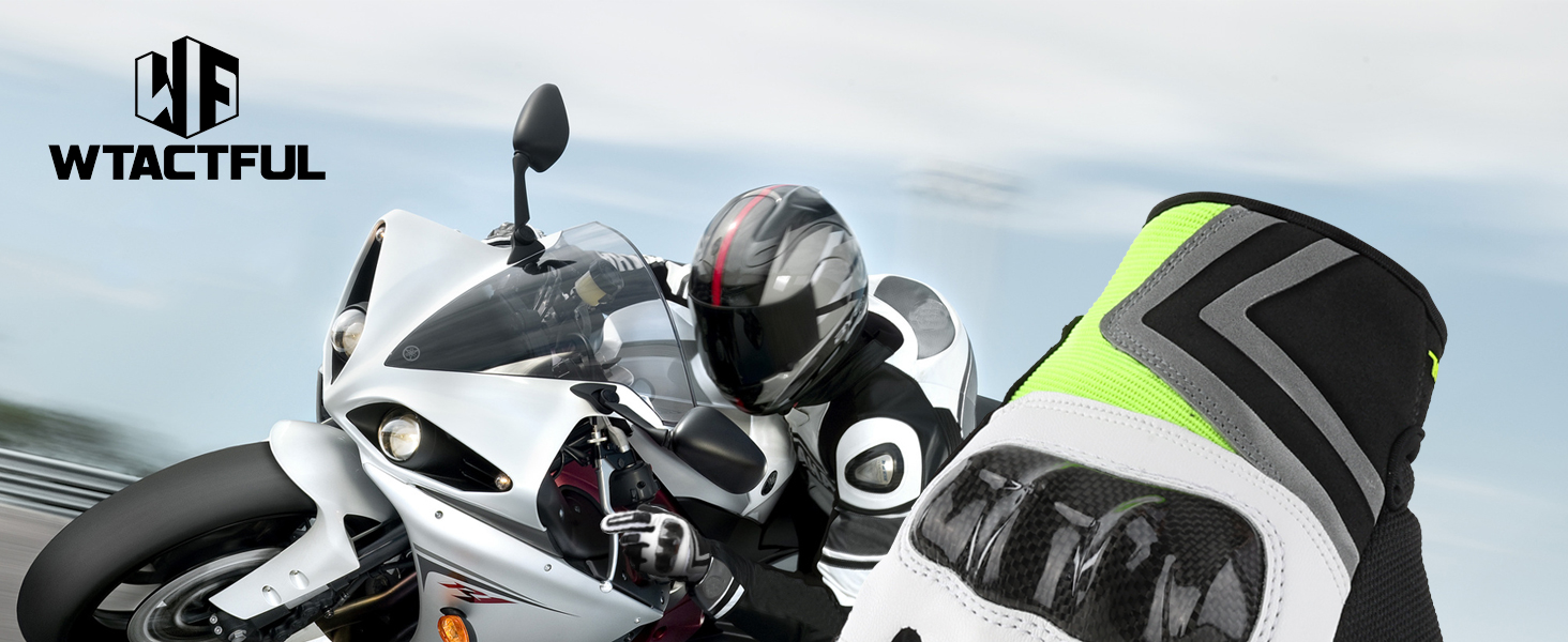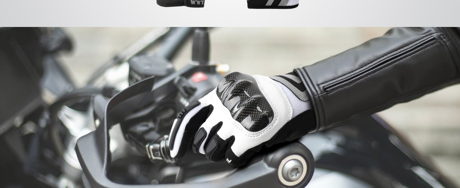 Protective Carbon Fiber Hard Knuckle Motorcycle Gloves: Features a lightweight carbon fiber knuckle shell for impact protection, with color-matched rubber strips on fingers for added safety and style. Available in three versatile colors: classic all-black, sporty black/white, and high-visibility fluorescent green for enhanced safety.