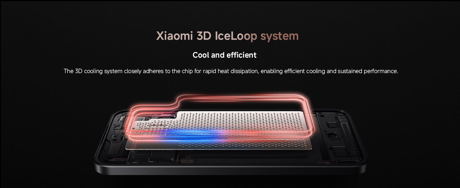 【Xiaomi 3D IceLoop system, Cool and efficient】The 3D cooling system closely adheres to the chip for rapid heat dissipation, enabling efficient cooling and sustained performance.