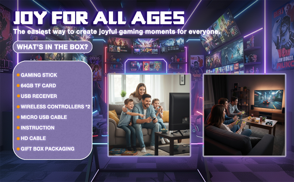 - 【Effortless Setup in Minutes】: Get gaming in just 3 simple steps: connect to your TV's HDMI, plug in for power, and switch the source. After inserting batteries (not included) into the controllers, you're ready to go!