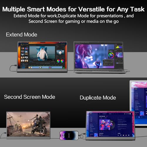 - 【Multiple Display Modes & Rotatable Screen】The portable monitor supports multi practical modes: Extended Mode (for multitasking, such as split screen editing documents, browsing the web), Mirror Mode (screen duplication), and Second Screen Mode (for presentations and teaching where the same content needs to be presented simultaneously). It can be used in both landscape and portrait orientations, making it ideal for coding, reading, or designing.
