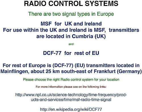 Radio Controlled clock ( MSF – UK and Ireland Version and Ireland ), Automatic time change for Spring & Autumn and automatic time checks. 12/24 h time display with calendar & weekday.