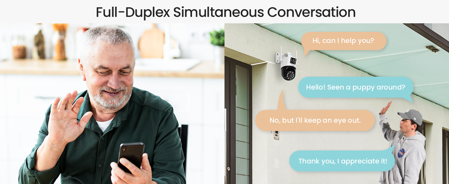- 【Interactive Two-Way Audio and Personalized Voice Alerts】Featuring a waterproof microphone and speaker, this security camera enables seamless real-time audio communication with anyone in front of the lens. Take control with customizable voice alerts tailored to your surveillance needs. Record your own personalized warning messages to warmly welcome guests or firmly deter intruders.
