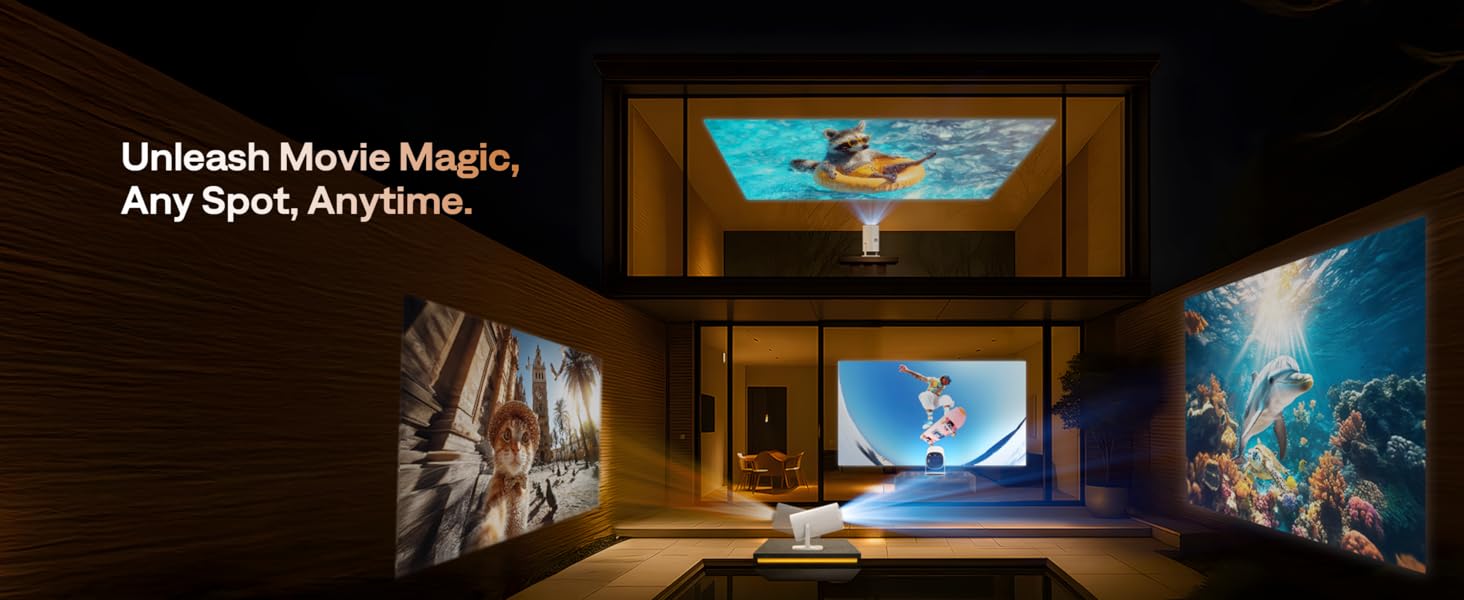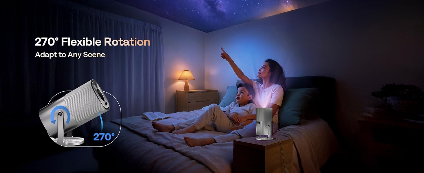 - 【270° Rotatable Metal Stand | Project Anywhere with Ease】Unlike most portable projectors that use plastic shafts limited to 180° rotation, our smart projector is built with a precision-engineered metal hinge that supports a full 270° range. It adjusts freely from -45° to 225°, allowing smooth ceiling projection and multi-directional positioning. The reinforced structure ensures long-lasting stability and smooth operation, while its versatile design blends effortlessly into any environment—be it the living room, office, or garden—for an elevated viewing experience from any angle.