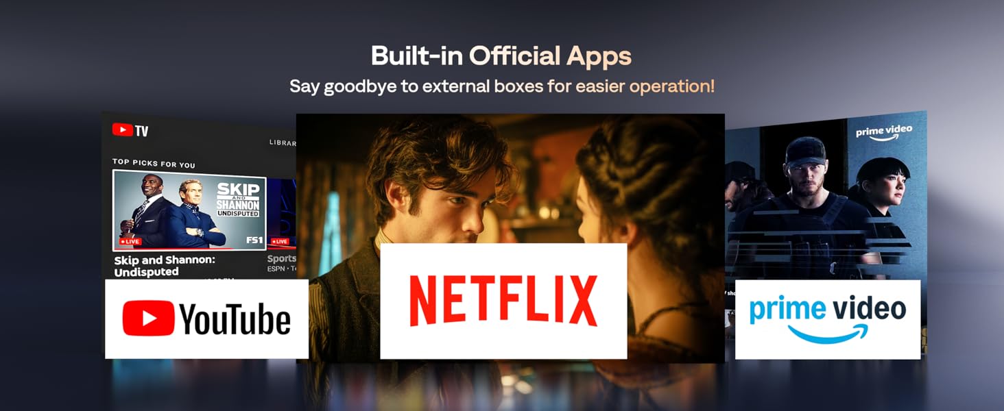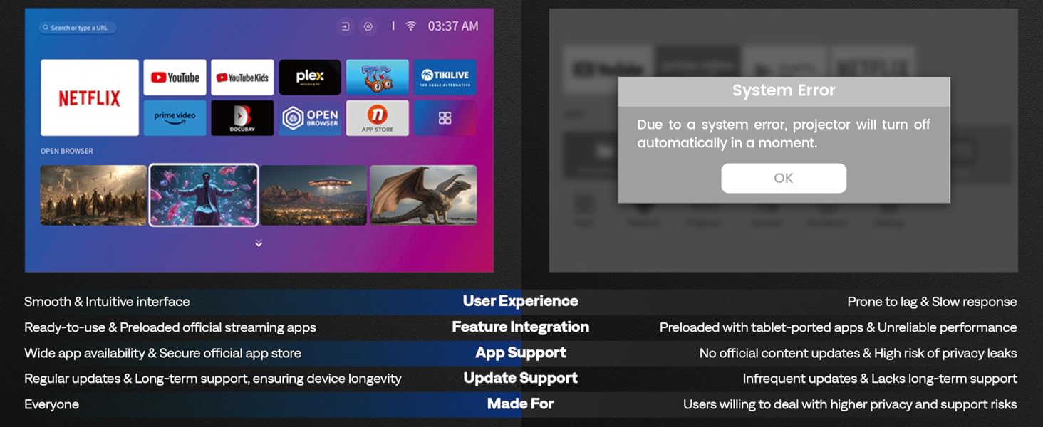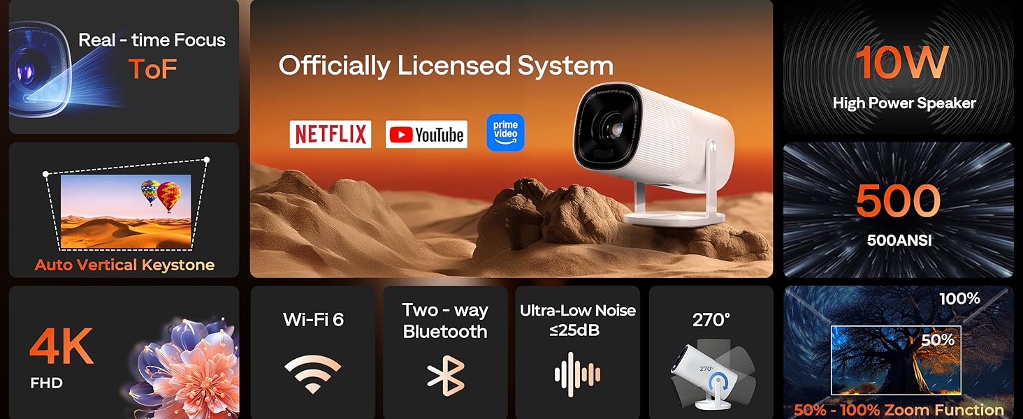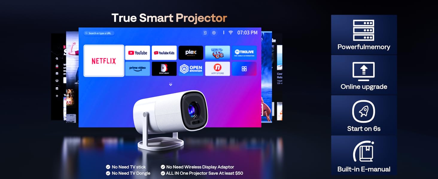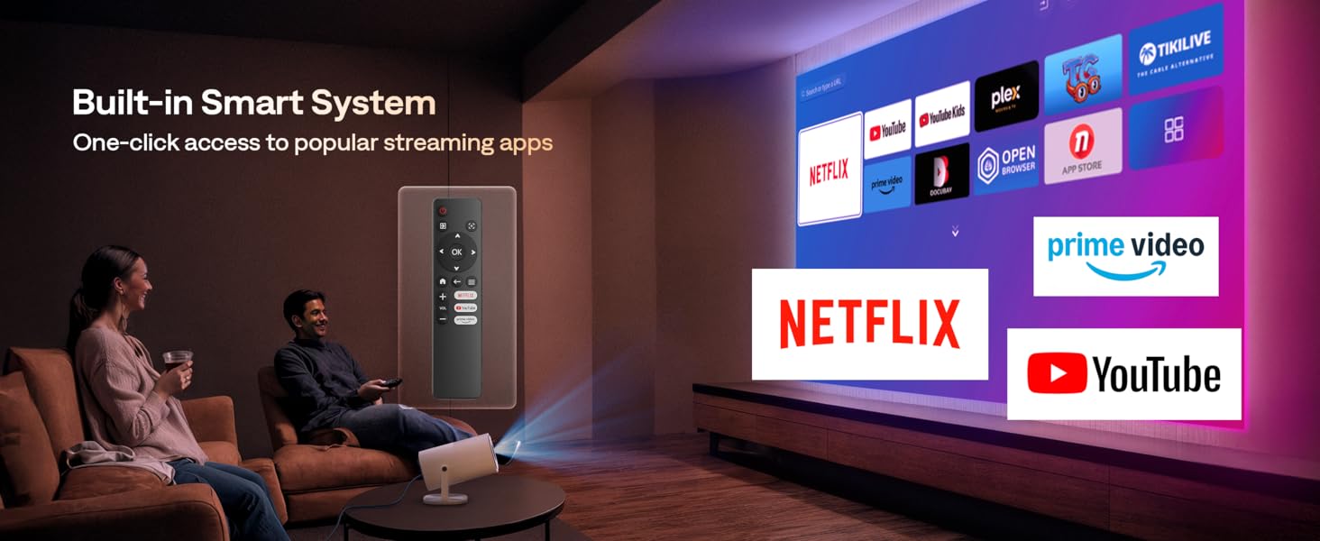 Merchant video- 【Official NetfIix Certified | Unlimited Content — Real, Safe, and Stable】 Unlike Android systems that may crash or lose app access, our smart projector runs on an officially licensed Smart TV system—offering unlimited premium content from NetfIix, YouTube, Prime Video, and more. Access over 1.5 million verified titles with one click from the remote control menu—no TV stick or pirated apps required. The certified system eliminates the black-screen issues common in budget projectors under $70, ensuring a stable, secure, and truly immersive viewing experience. With seamless updates, smooth performance, and enhanced privacy, it’s the ultimate all-in-one smart entertainment solution.