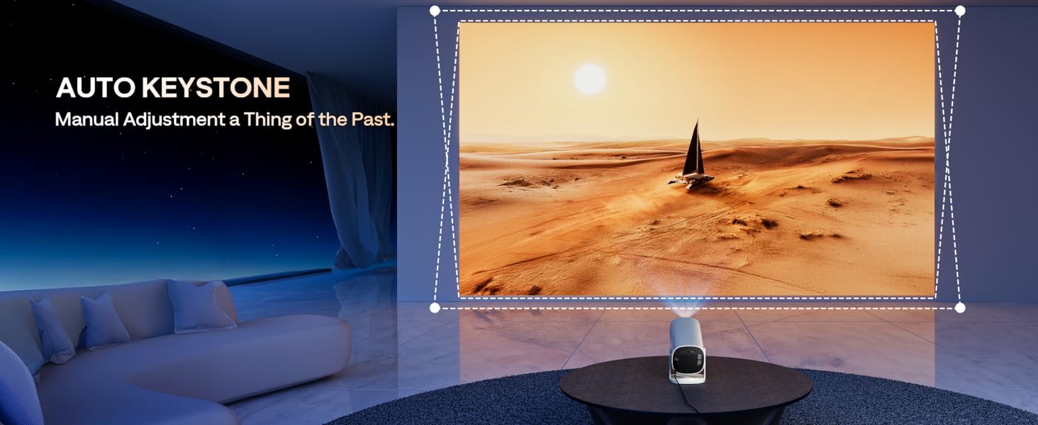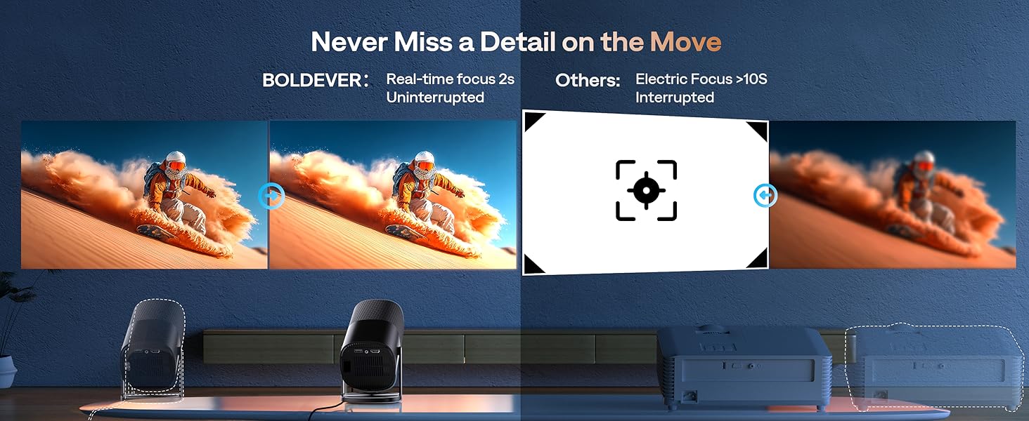 - 【AI Fully Automatic | 2s TOF Auto Focus & Keystone, 5× Faster and Smarter】 Powered by advanced TOF (Time-of-Flight) technology, the mini projector automatically focuses in just 2 seconds, keeping images crystal-clear at all times. That’s 4× faster than traditional outdoor projectors that take up to 10 seconds to adjust. With Auto Vertical Keystone Correction, it automatically straightens the picture—no matter where you place it—delivering a perfectly aligned, rectangular image instantly. Enjoy effortless setup, instant clarity, and smooth, interruption-free viewing without any manual adjustments.