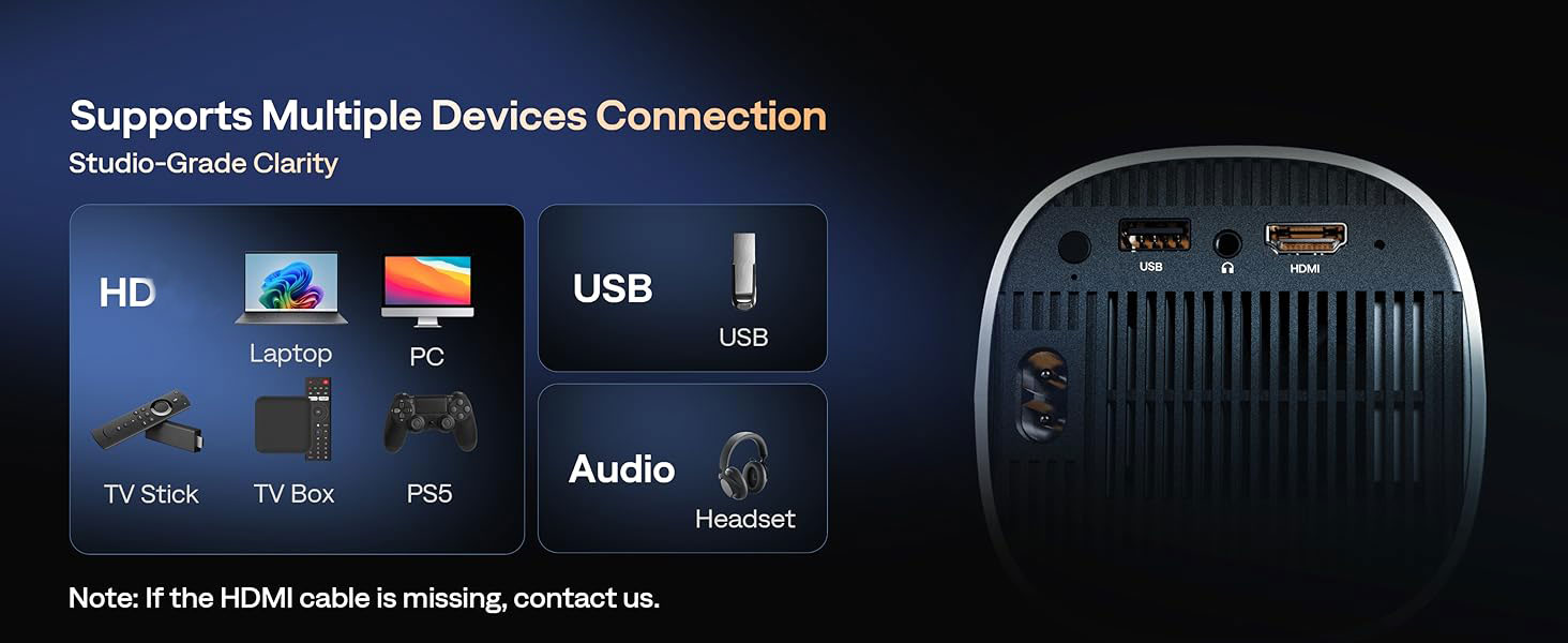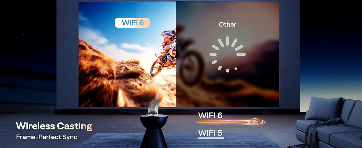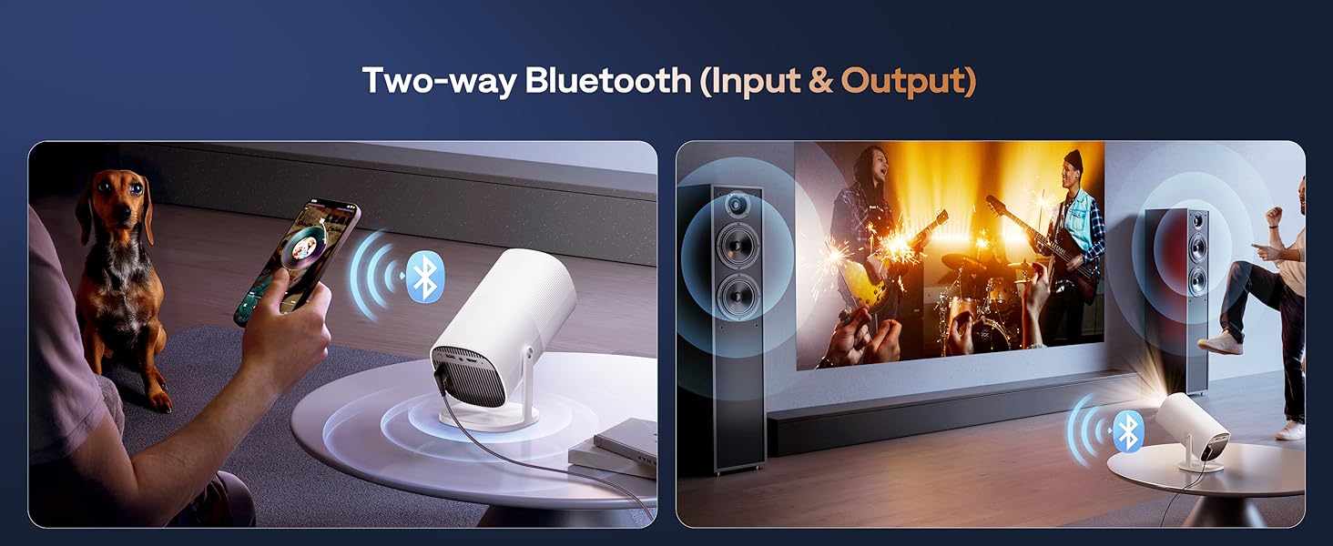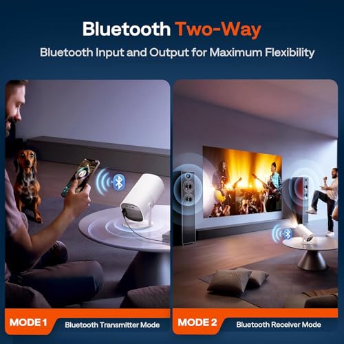 - 【WiFi 6 & Two-way Bluetooth 5.2 | Fast, Flexible, and Wireless Freedom】 This movie projector features lightning-fast WiFi 6 with speeds up to 9.6 Gbps—nearly triple that of WiFi 5. It supports Apple devices, Miracast, DLNA, AirPlay, TV sticks, Roku, laptops, iPhones, Android devices, iPads, USB drives, and Switch/PS5, boosting gaming and wireless projection. Its Bluetooth 5.2 supports two-way audio transmission, allowing you to use the bluetooth projector as a standalone stereo speaker or connect to external Bluetooth speakers, headphones, or soundbars to enhance your home audio experience anytime, anywhere. Please note: Bluetooth supports audio transmission only, not video.