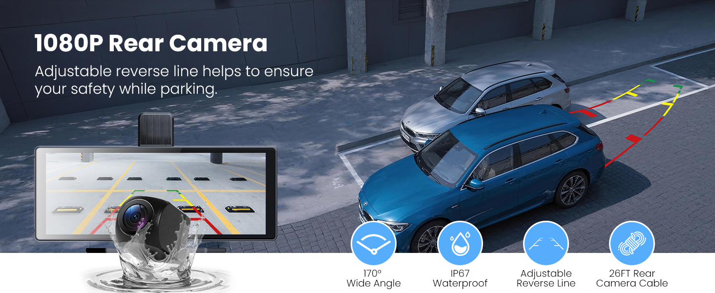 【4K+1080P Dual Recording & Parking Monitoring】 The CarPlay screen features 4K front and 1080P rear cameras with 170° wide-angle coverage for simultaneous recording. Delivers clear, smooth footage with built-in G-sensor that auto-locks collision videos. Automatically switches to rear view with guiding lines when reversing, integrating parking monitoring and safety backup functions