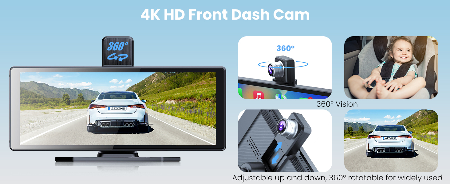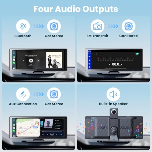 10.26'' Car Play Screen, Carplay Screen for Apple Car Play & Android Auto, Car Tablet with 360° Rotatable 4K Front + Rear 1080P Dual Camera Dash Cam, Mirror Link/Voice Assistant/64GB TF Card