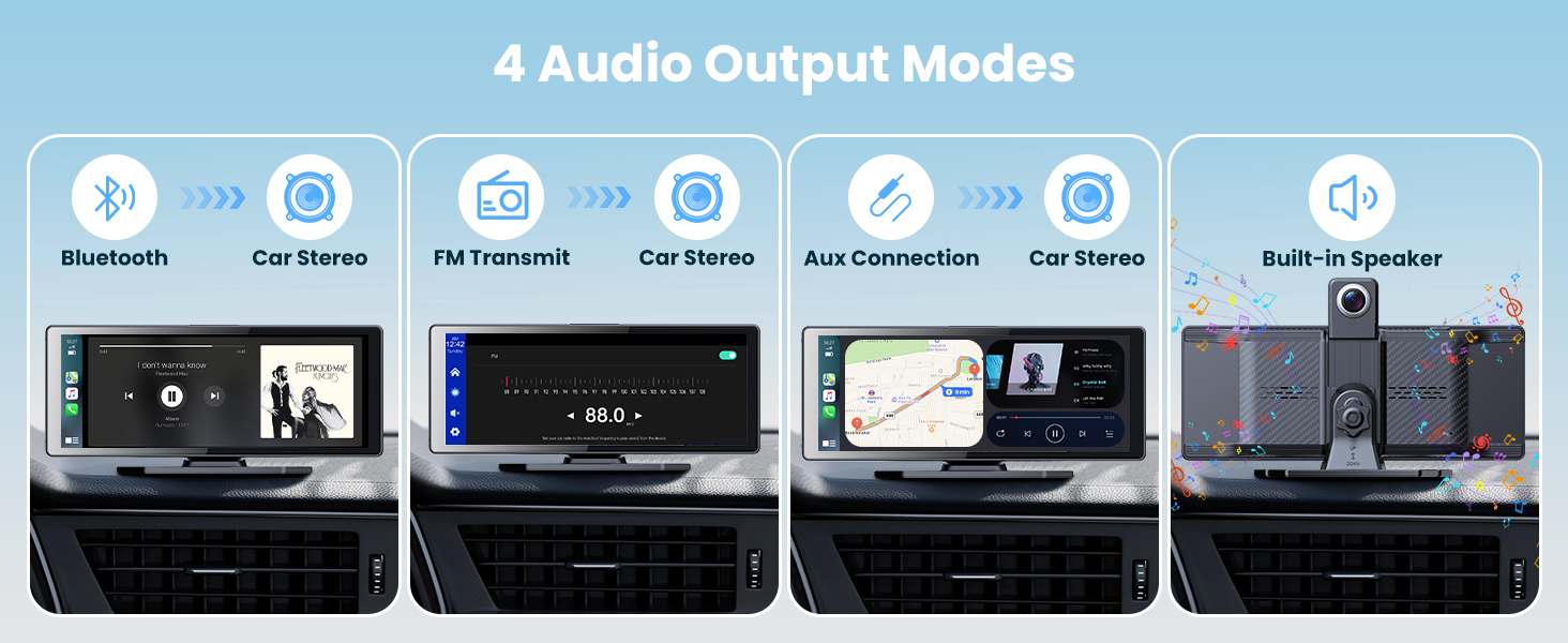 【4 Audio Outputs & Bluetooth 5.0】This car tablet offers four audio output modes: Bluetooth 5.0, AUX cable, FM transmission, and built-in speakers, compatible with various car audio systems. Delivers stable, low-latency transmission for high-quality music and call audio