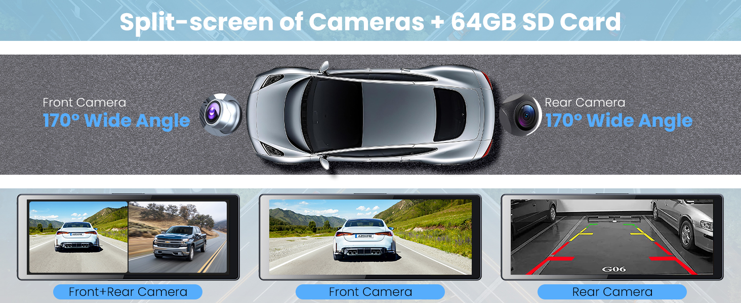 【360° Rotatable Lens & Split-Screen Display】 The front camera rotates 360° for monitoring interior/front/side areas. It vertically adjusts and extends. Supports split-screen display showing navigation and live footage simultaneously. Includes 64GB TF card with night vision and loop recording