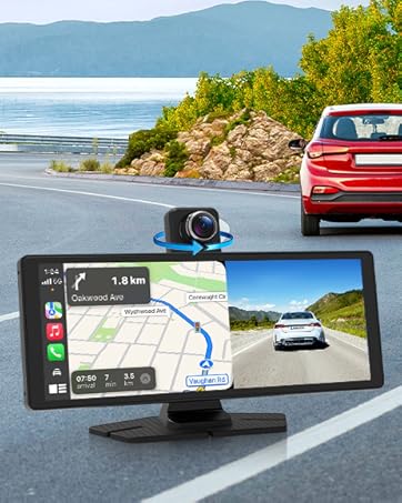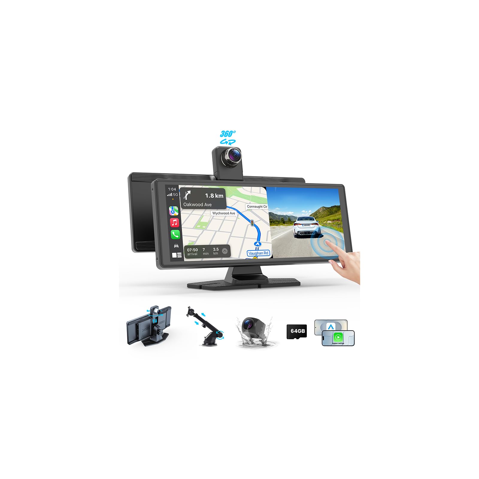 - 360° Rotatable 4K Dash Cam & IP65 1080P Rear Camera: 4K front camera with loop recording and a G-sensor for automatic incident detection. Easily rotate the camera to keep an eye on kids in the back seat, ideal for school runs or road trips. 64GB SD card for all your driving memories. IP65 1080P waterproof reversing camera, cope with various working environments. The carplay screen will switches to the reverse image and displays the reversing auxiliary line, with a large screen and a 170° wide-angle view for better visibility when parking