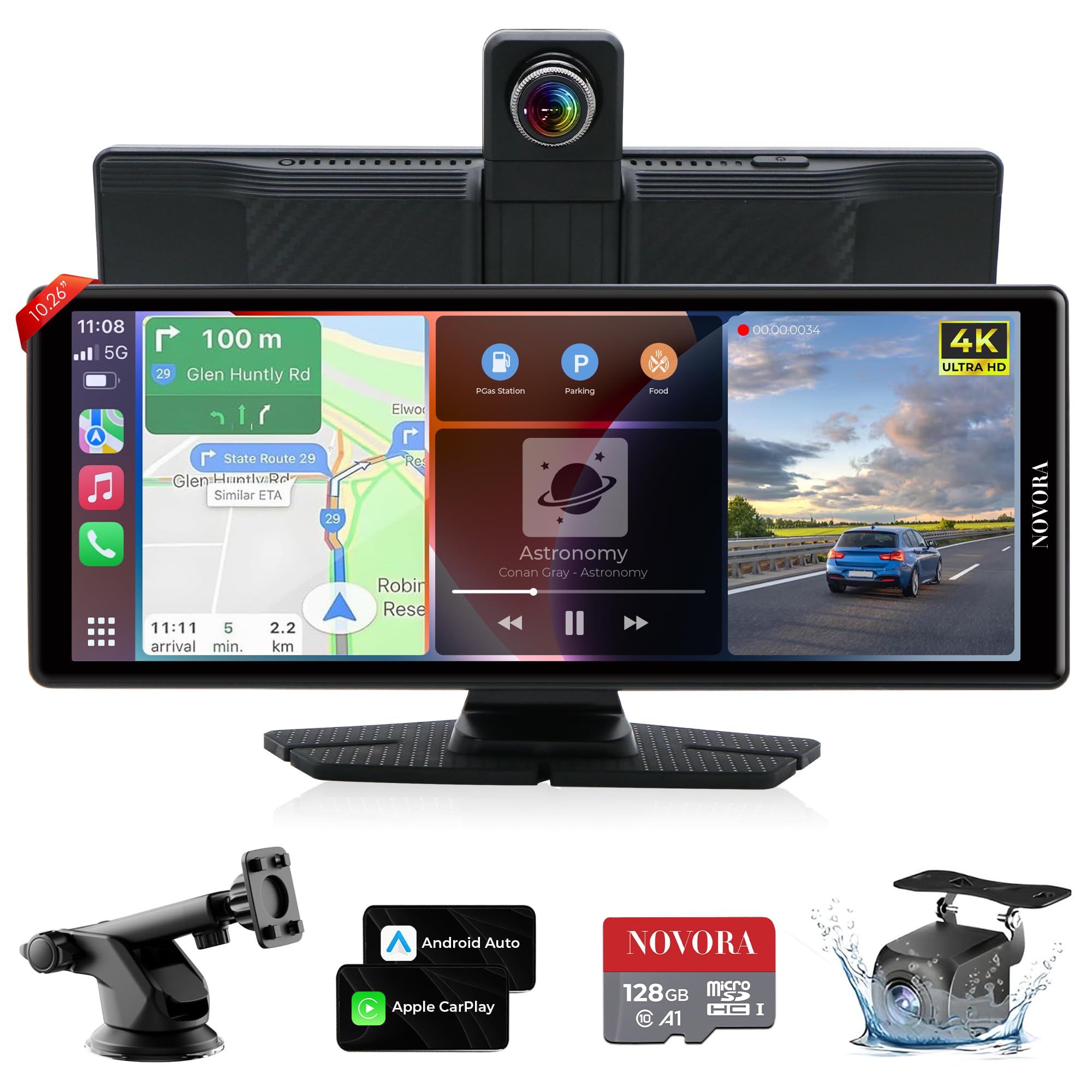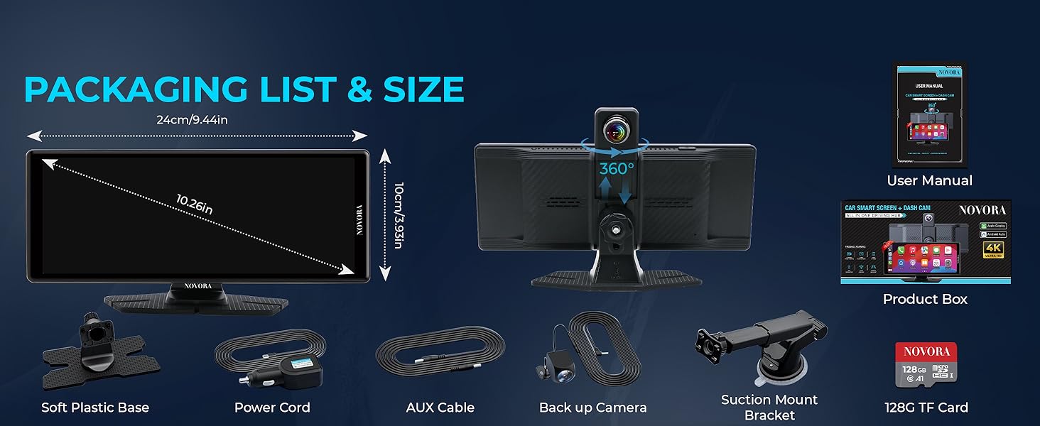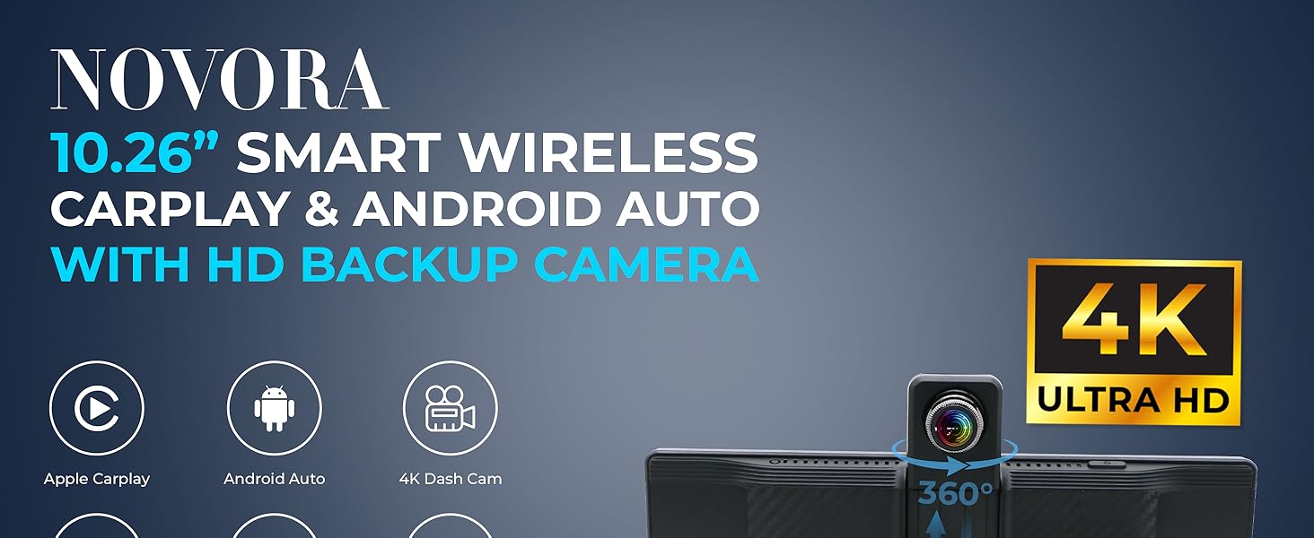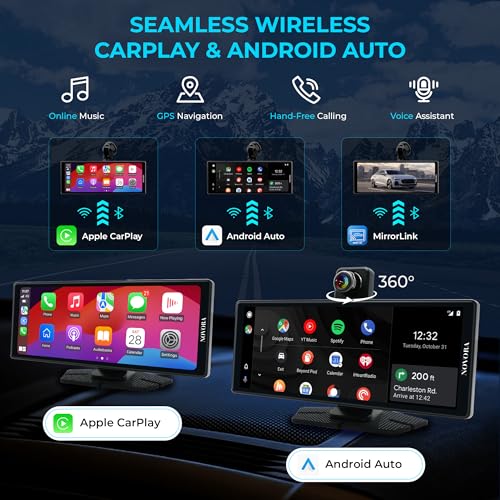 10.26” Wireless CarPlay Screen with 360° Rotation Camera, 4K Dash Cam, 1080p Rear Camera, Android Auto, GPS, Mirror Link, Siri/Google Voice Control, HD Touch Display + Free 128GB TF Card
