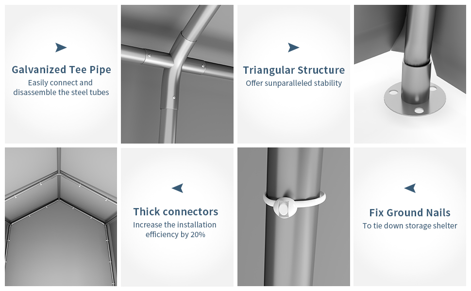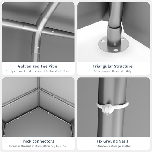 - Heavy Duty Protection: The storage shed features thick iron pipes with a gauge of 23Ga. The elastic ball straps ensure the canopy is firmly attached to the frame. The base plate provides solid support , enhancing overall stability and safety while extending its lifespan.