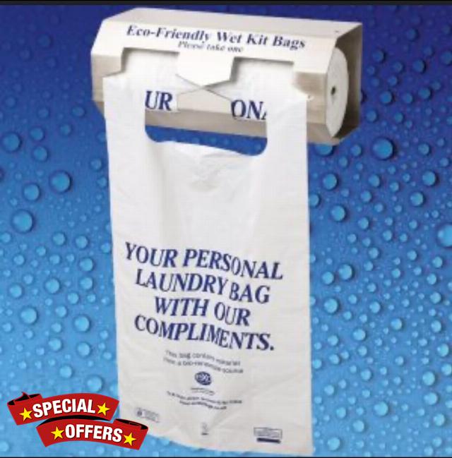 1000 (4×250) Disposable Printed Wet Kit Bags in a White HD Poly Material. Printed in Blue Text 'Your Personal Laundry Bag with our Compliments', Perforated on a Roll. Sports Clubs, Leisure Centres