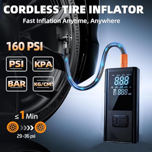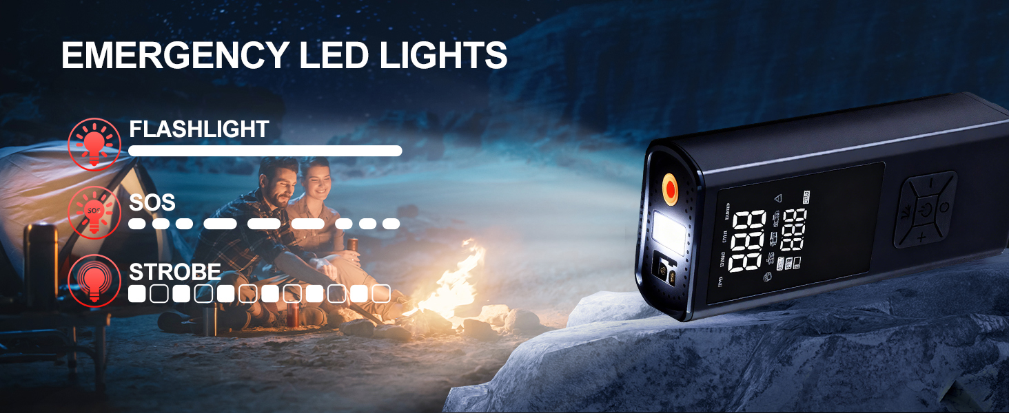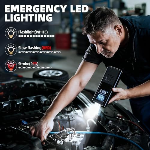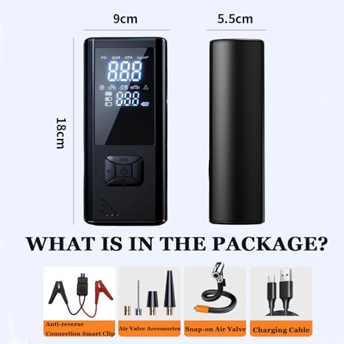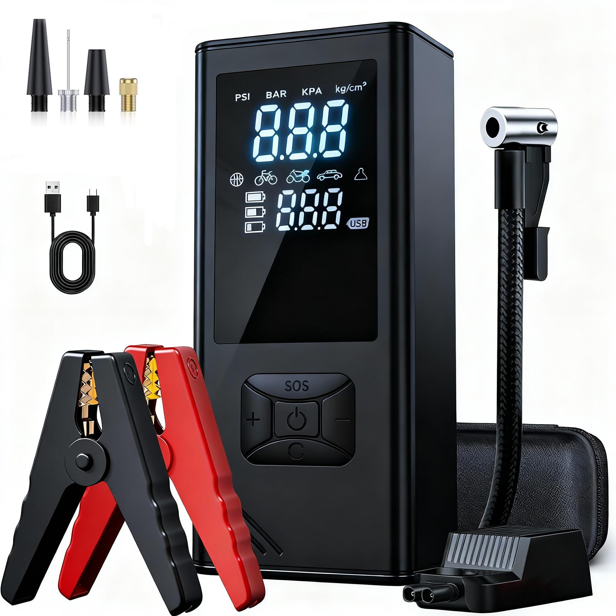150 PSI Built-In Tire Inflator: Built-in mini compressor with max 150 PSI pressure, perfect for car tires, air cushions, kayaks, balls and more. Connect the hose, press start and monitor real-time tire pressure on the display. Easy to use, helping you maintain proper tire pressure.