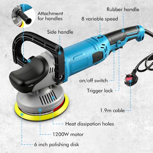 1200W Car Polisher Kit, Car Buffer Polisher Machine, 8 Variable Speeds 1000-4200 OPM, Line length – 2 meters, 5’’ Self-adhesive Disc, 26 PCS Professional Kit, for Car Polishing, Family Cleaning