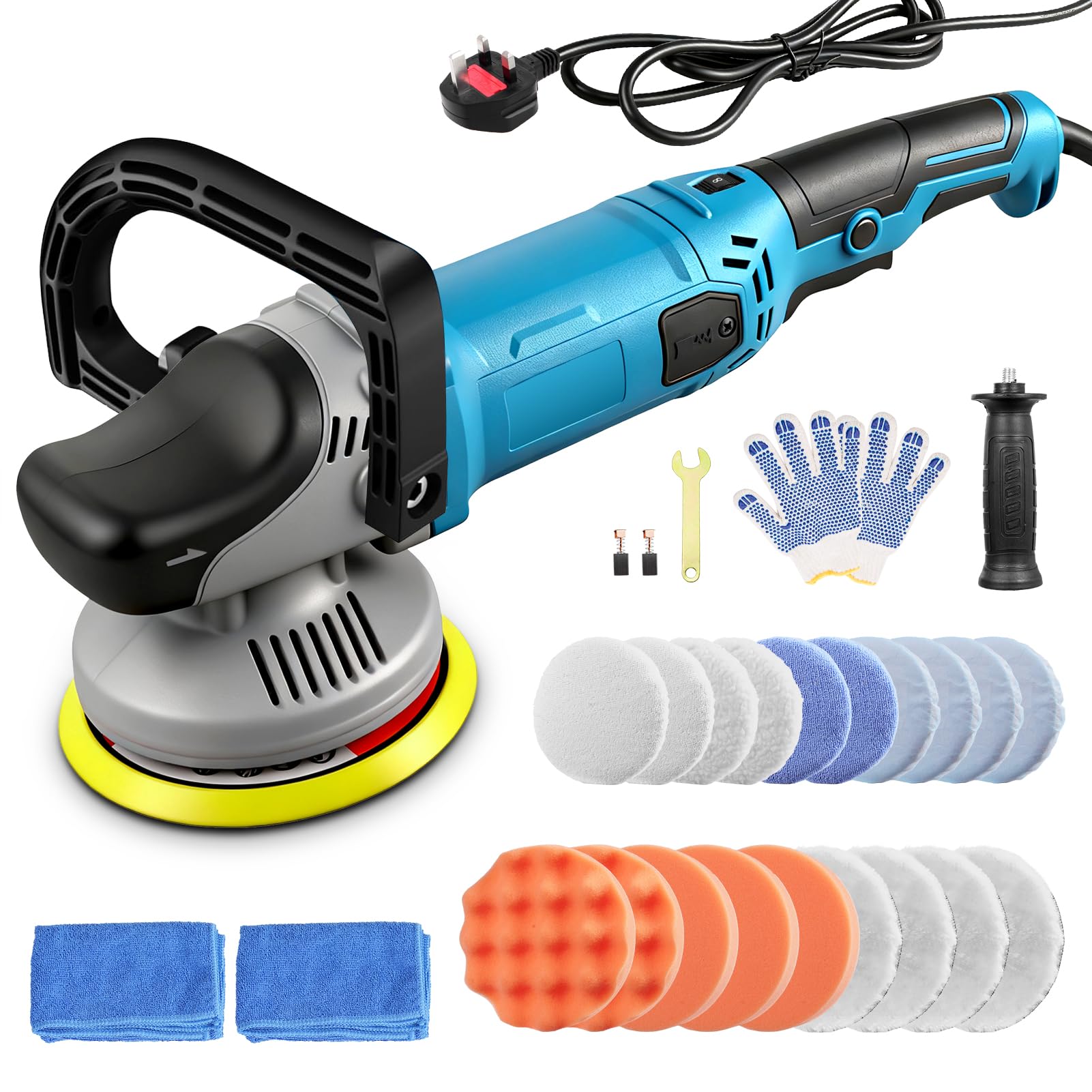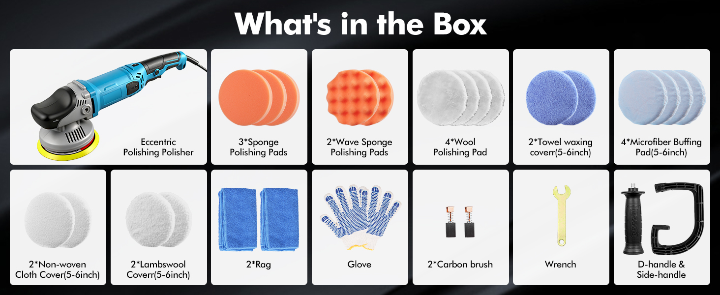 【Complete Accessory Set Included】 Comes with 3 flat pads, 2 wave pads, 4 wool pads, 2 carbon brushes, 2 handles, gloves, 2 microfibre cloths, multiple 5–6 inch bonnets and applicator covers, plus a strong 150mm hook-and-loop backing plate.