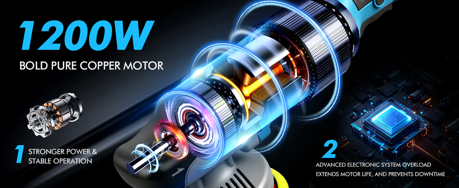 【1200W High-Performance Motor】 Powerful 1200W motor with full ball-bearing construction ensures smooth, stable output. Integrated cooling vents prevent overheating during long use, keeping the machine efficient and safe.
