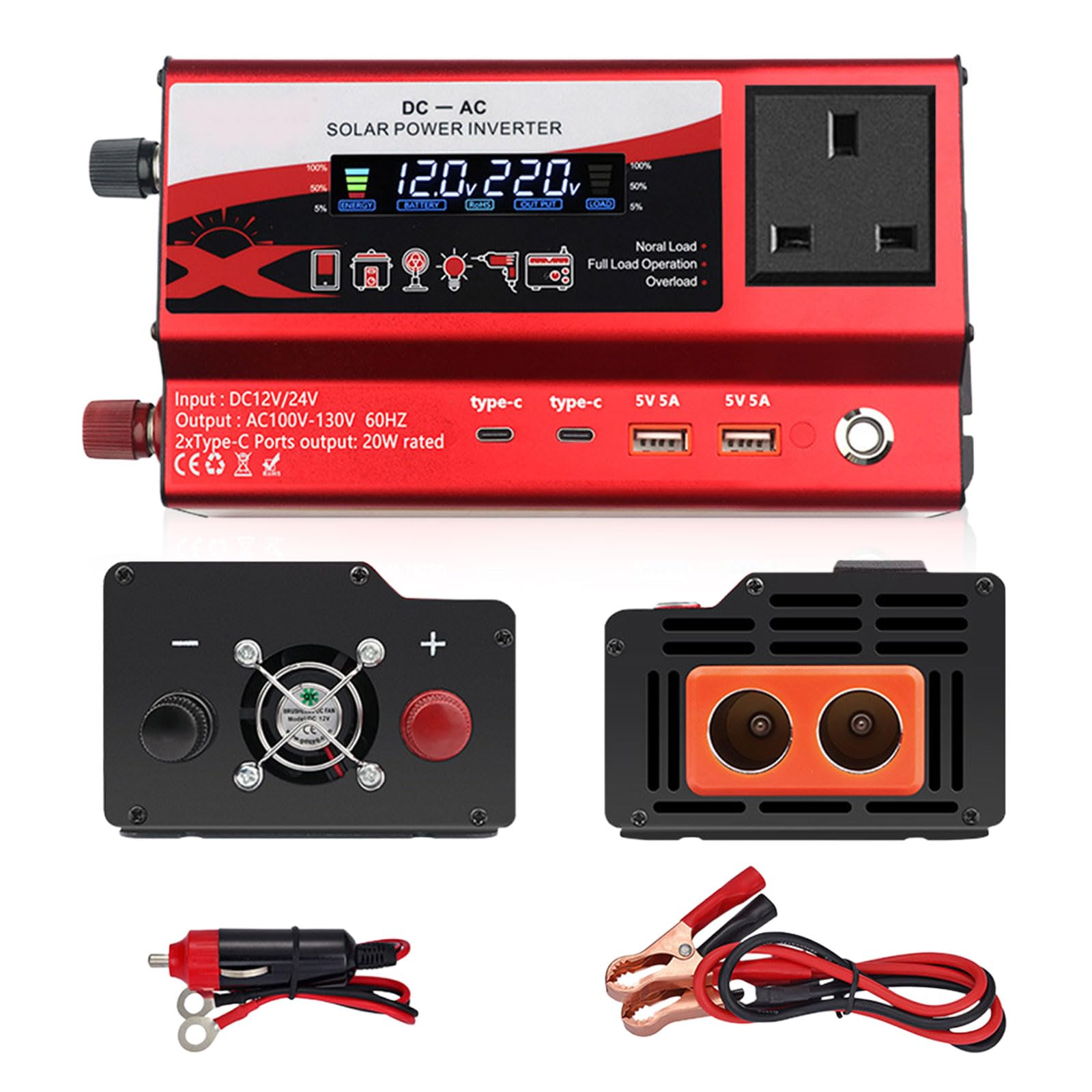 1200W Car Power Inverter DC 12V/24V to AC 220V, Pure Sine Wave Inverter with UK Plug, 2 Type-C and 2 Cigarette Lighter and LED Display, Mood Lighting for Travel, Camping, RV