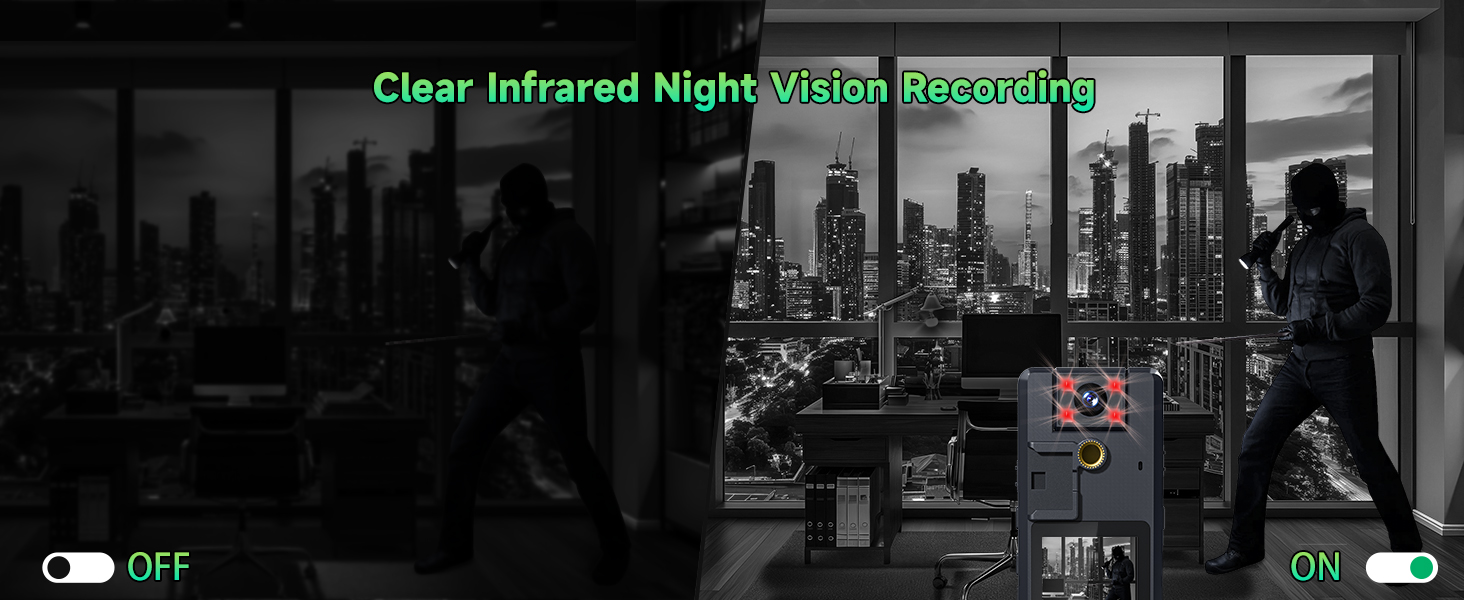 - 16 FEET IR Night Vision: A completely lightless basement? A dimly lit street? Simply press the "lamp" button to instantly activate the infrared night vision function. It ensures clear capture of faces and even patterns on clothing (up to 16 feet range), even in total darkness