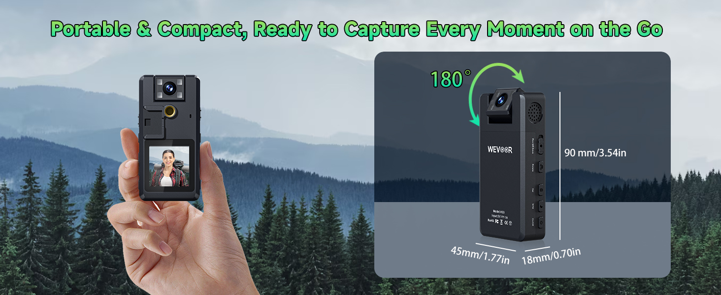 1296P Mini Video Body Camera 64GB 20Hrs Portable Wearable Police Camcorder, 180° Rotatable Lens, 1 Spare Battery, Wevoor Personal Small Cameras wirh Back Clip, Night Vision for Security/Outdoor/Travel