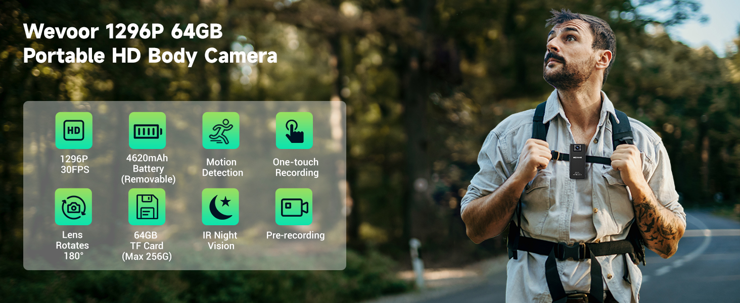 1296P Mini Video Body Camera 64GB 20Hrs Portable Wearable Police Camcorder, 180° Rotatable Lens, 1 Spare Battery, Wevoor Personal Small Cameras wirh Back Clip, Night Vision for Security/Outdoor/Travel