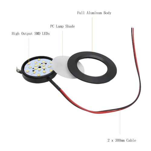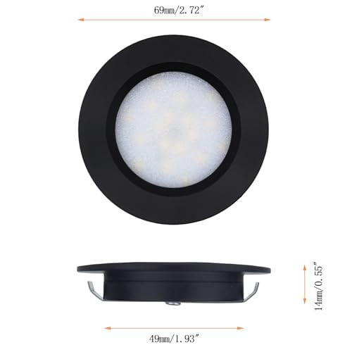 【Recessed Mount】Ceiling light has 69 mm (2.72”) diameter and 14 mm (0.55”) depth, with pre-wired cable 30 cm/ 11.81 inch, there is no need for screws, just insert the camper lights into the hole after connecting the power supply, mounting hole diameter 55-60 mm/2.16-2.36 inch