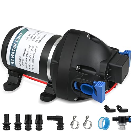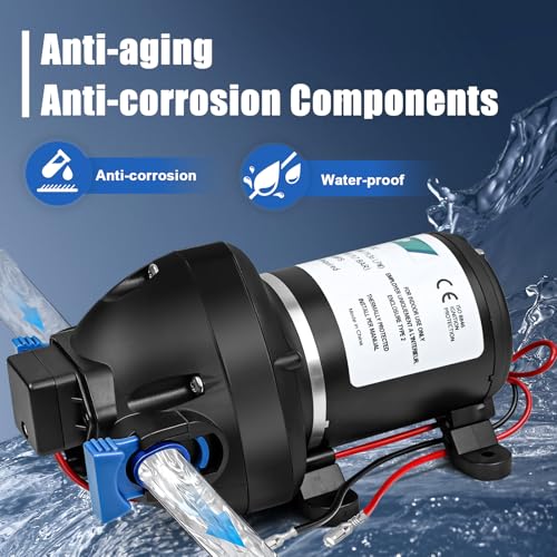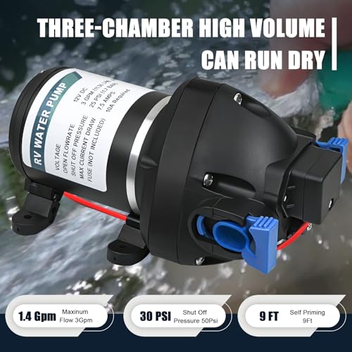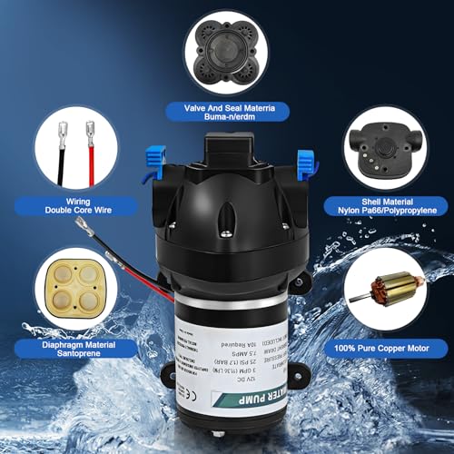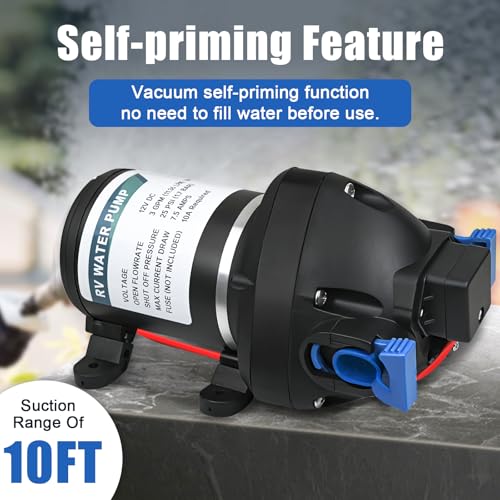 - High Performance Self-Priming Pump – With a flow rate of up to 11.36 L/min (approx. 3 GPM) and a maximum pressure of 25 PSI, this 12 V diaphragm pump delivers reliable water supply in a variety of settings, from campervans to garden irrigation.
