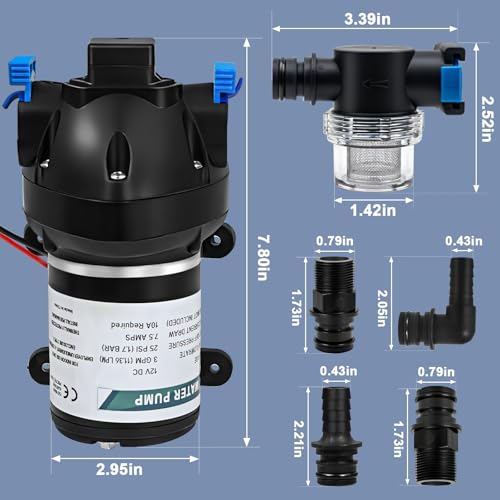 12V DC Water Pump – 3 GPM (11.36 L/min), Up to 25 PSI Pressure – Self-Priming Diaphragm Pump with Heavy Duty Pressure Switch and Strainer, Ideal for RV, Marine, Campervan, Agricultural & Garden Use