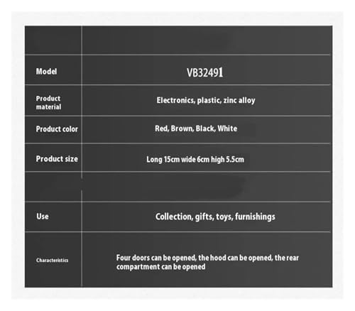 Product Introduction Product Name: 1:32 Car Model Toys Product Colors: White , Black , Red , Brown Material: Alloy + Plastic Chassis + Rubber Tire+Electronic components Category :High Simulation Car Model Product size: 15*6*5.5cm Features: All four doors can be opened, the hood can be opened, and the trunk can be opened.