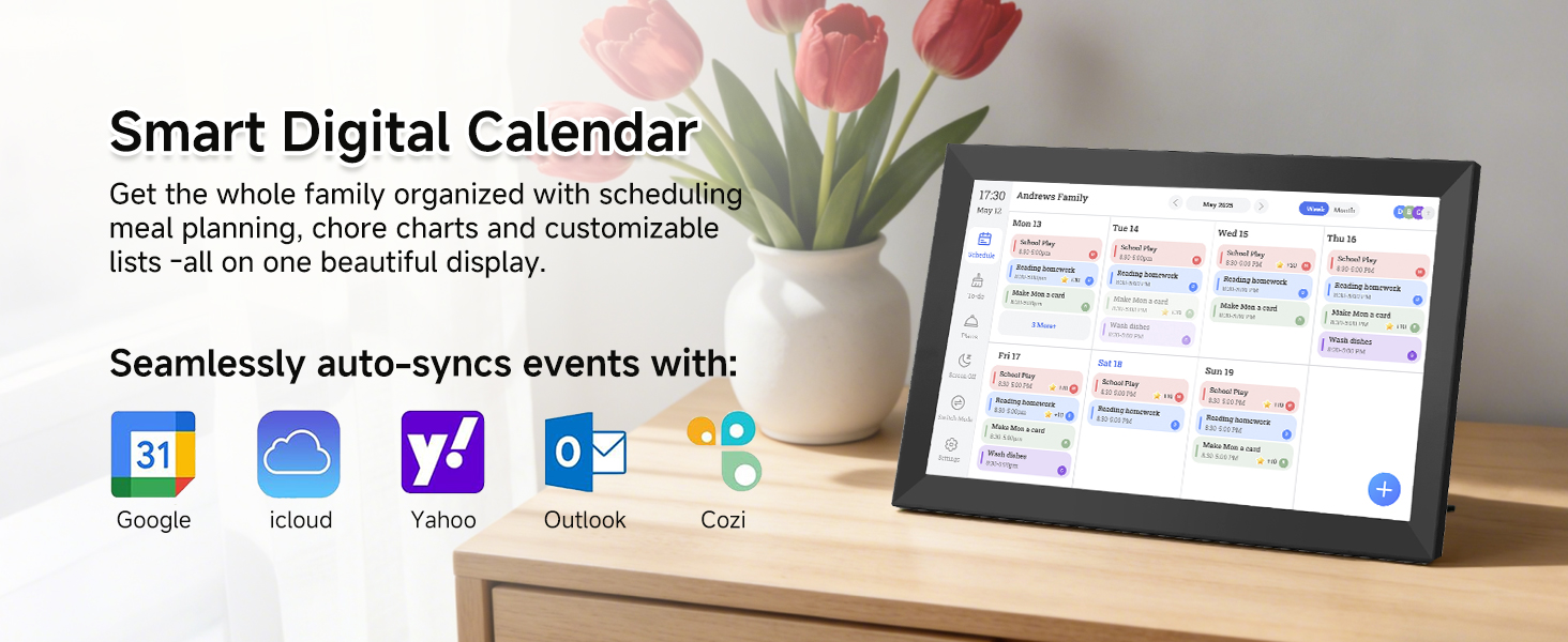- Easy Setup & Instant Sync Just plug in, connect to wifi, and sync calendars in minutes! Works seamlessly with Google, Outlook, iCloud, Cozi, and Yahoo. Then add events directly on the device or through the FotoCube app.
