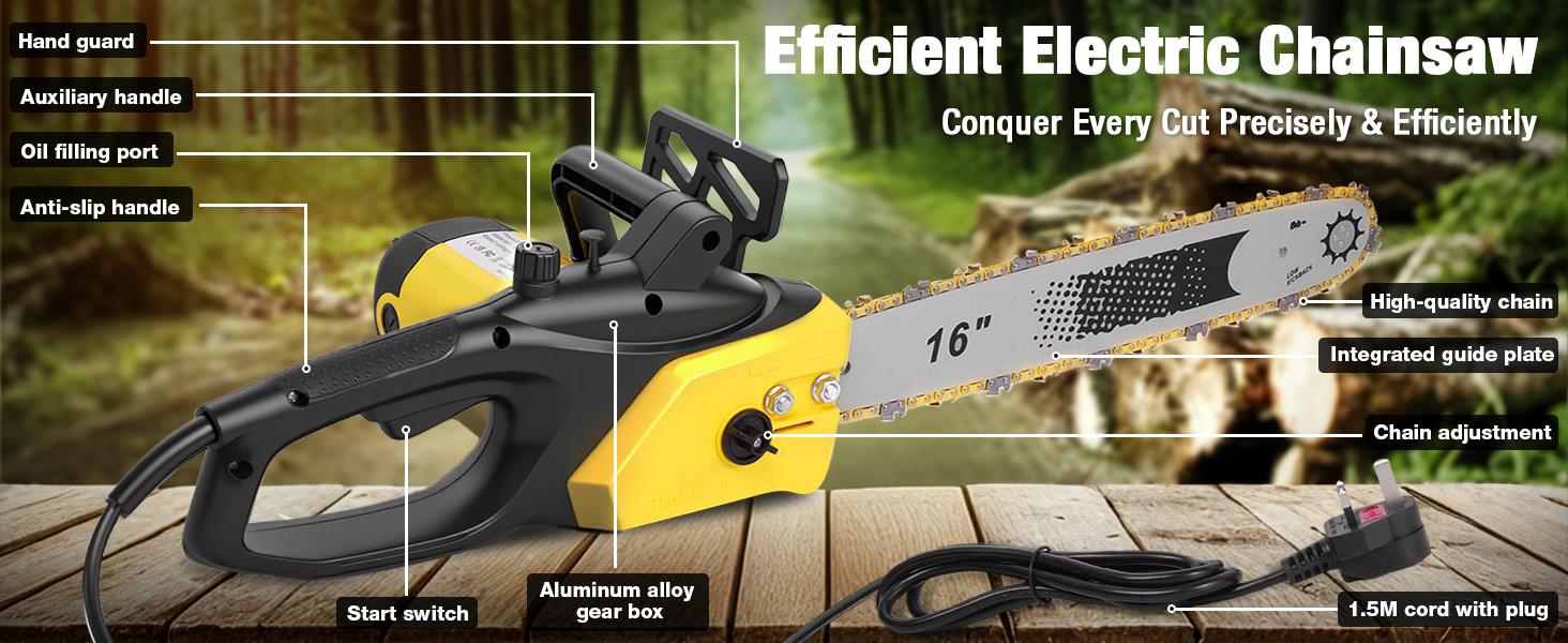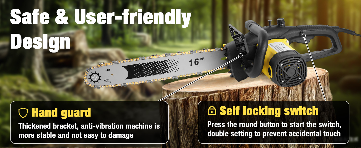 - 【Instant Start】Our chainsaw cord is 1.5m (5ft) long, plug in the cord and turn on the switch, the corded chainsaw can work instantly and is less noisy than petrol chainsaws. You don't need to worry about the negative impact of excessive noise during your use